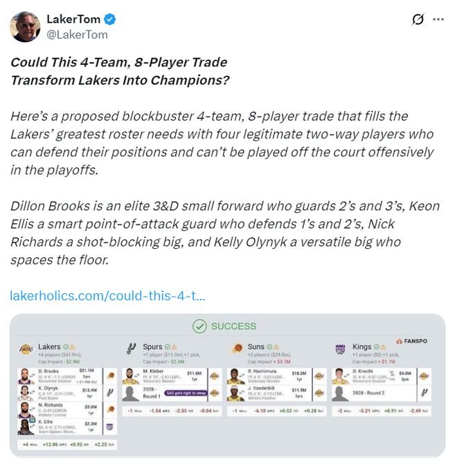 他列举了一套四方大交易方案:马刺、湖人、太阳、国王,这笔交易湖人就可以得到四个新援: