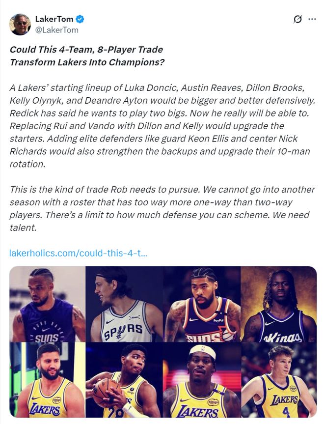 湖人媒体Laker Tom却认为这支湖人队还是应该交易补强,大概率是觉得这套14+3名单根本没有夺冠的可能性,他觉得进行一笔四方交易可以帮助湖人蜕变,他写道:湖人应该继续提升这支球队的防守能力与尺寸,狄龙、奥利尼克、理查兹、埃利斯等人都是最好的补强。